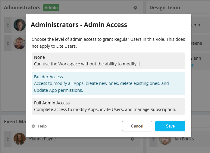 Builder Access allows Users assigned to this Role to modify all Apps within your Workspace, and create new ones.